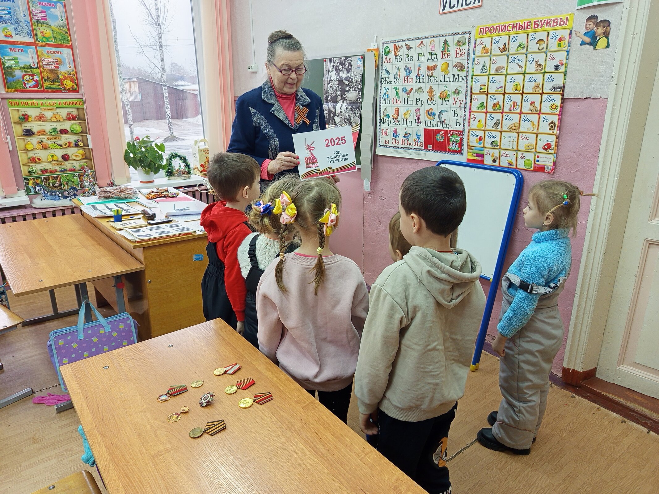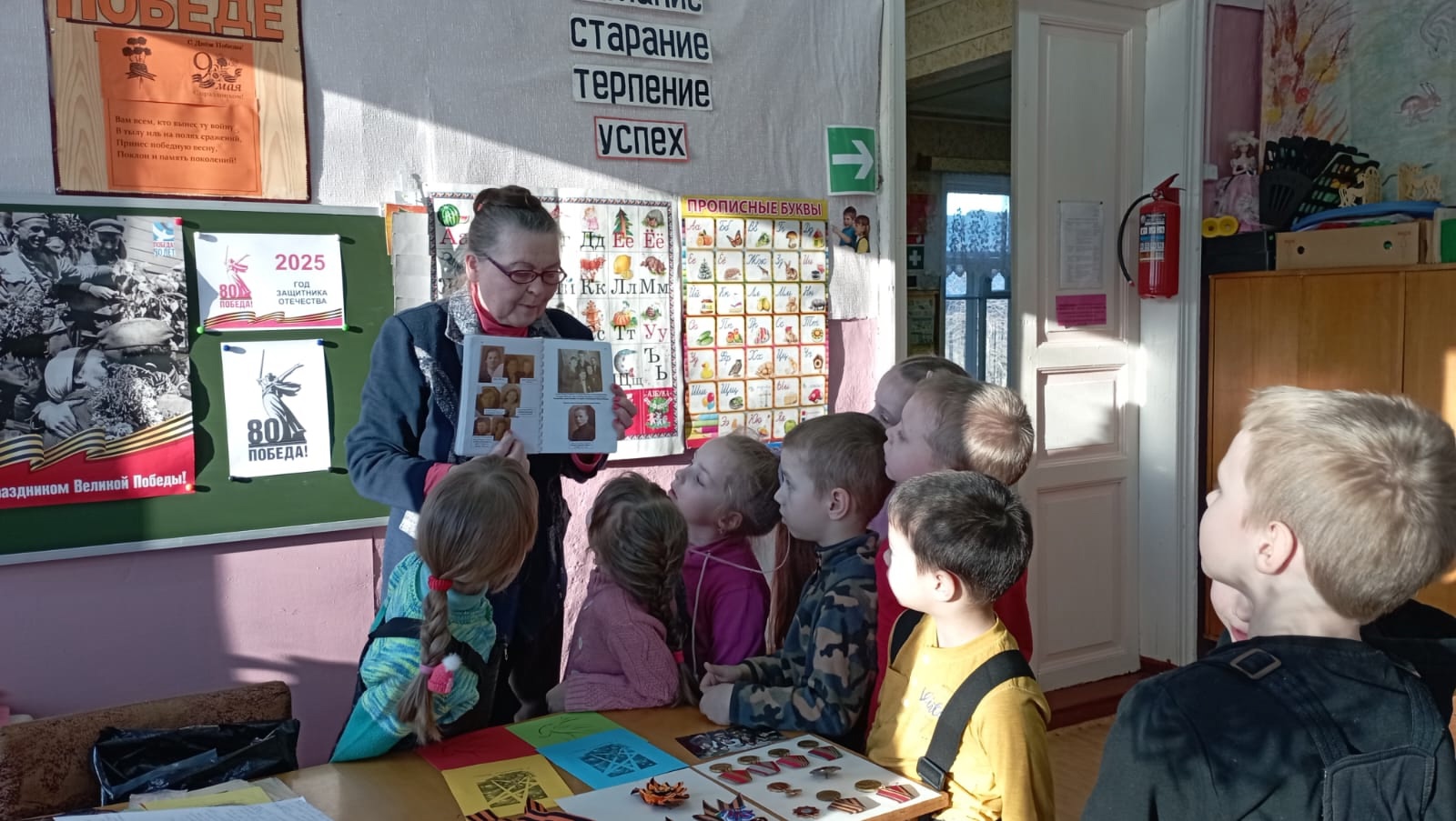 Дети познакомились с наградами за боевые заслуги принадлежавших Патрикееву Анатолию Алексеевичу, являющимися семейной реликвией семьи Патрикеевых. Зинаида Фёдоровна рассказала ребятам и о Весьегонских ветеранах - Тятькине А.А. и Васильеве А.В.