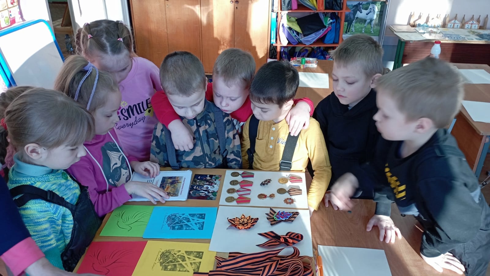Дети познакомились с наградами за боевые заслуги принадлежавших Патрикееву Анатолию Алексеевичу, являющимися семейной реликвией семьи Патрикеевых. Зинаида Фёдоровна рассказала ребятам и о Весьегонских ветеранах - Тятькине А.А. и Васильеве А.В.