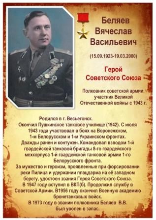 Окончив Пушкинское танковое училище, он всю свою жизнь посвятил служению Отечеству. Судьба и подвиг Героя Советского Союза Вячеслава Васильевича Беляева, который прославил наш край своим мужеством, смелостью и героизмом являются примером для подрастающего поколения и гордостью для земляков.