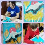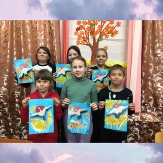 А юные художники студии «Волшебная палитра» создали трогательные рисунки с изображением белых журавлей, используя аппликацию и нетрадиционные техники рисования.