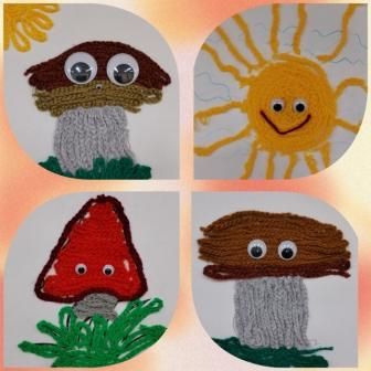 На картон нанесли понравившийся рисунок и приклеили цепочки необходимого цвета . Добавили глазки, и картинки как будто ожили.