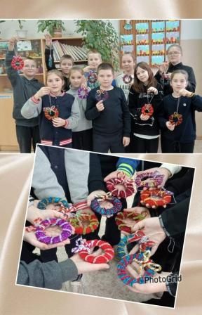 Дети из кружка "Мастерилка" изготовили новогодний веночек из синельной проволоки, которая напоминает о причудливых морозных узорах на окнах и о ледяном блеске зимних звёзд.