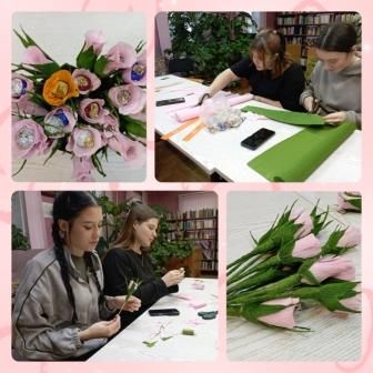 Девочки из кружка "Маршрут краеведа" организовали приятную акцию «Цветочки-конфетки» - своими руками сделали красивые розы из гофрированной бумаги, а внутри каждой спрятали сладкий сюрприз.Праздничным утром цветы вручили мамам и бабушкам, которые приводят малышей на занятия, подарив им маленький знак внимания.