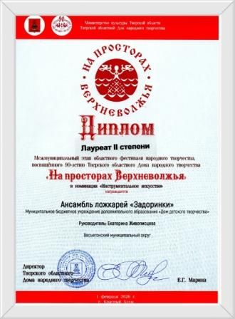 Ансамбль ложкарей «Задоринки» под руководством Е.А. Живописцевой стал лауреатом межмуниципального этапа областного фестиваля народного творчества «На просторах Верхневолжья»!