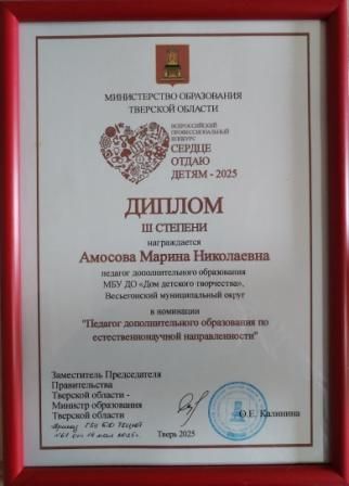 Педагог допобразования Амосова Марина Николаевна, представлявшая МБУДО "ДДТ", была награждена дипломом III степени в номинации "Педагог дополнительного образования по естественнонаучной направленности".